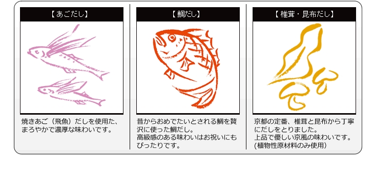 味わいは「あごだし」、「鯛だし」、「椎茸・昆布だし」、3種類のタイプがあります。
