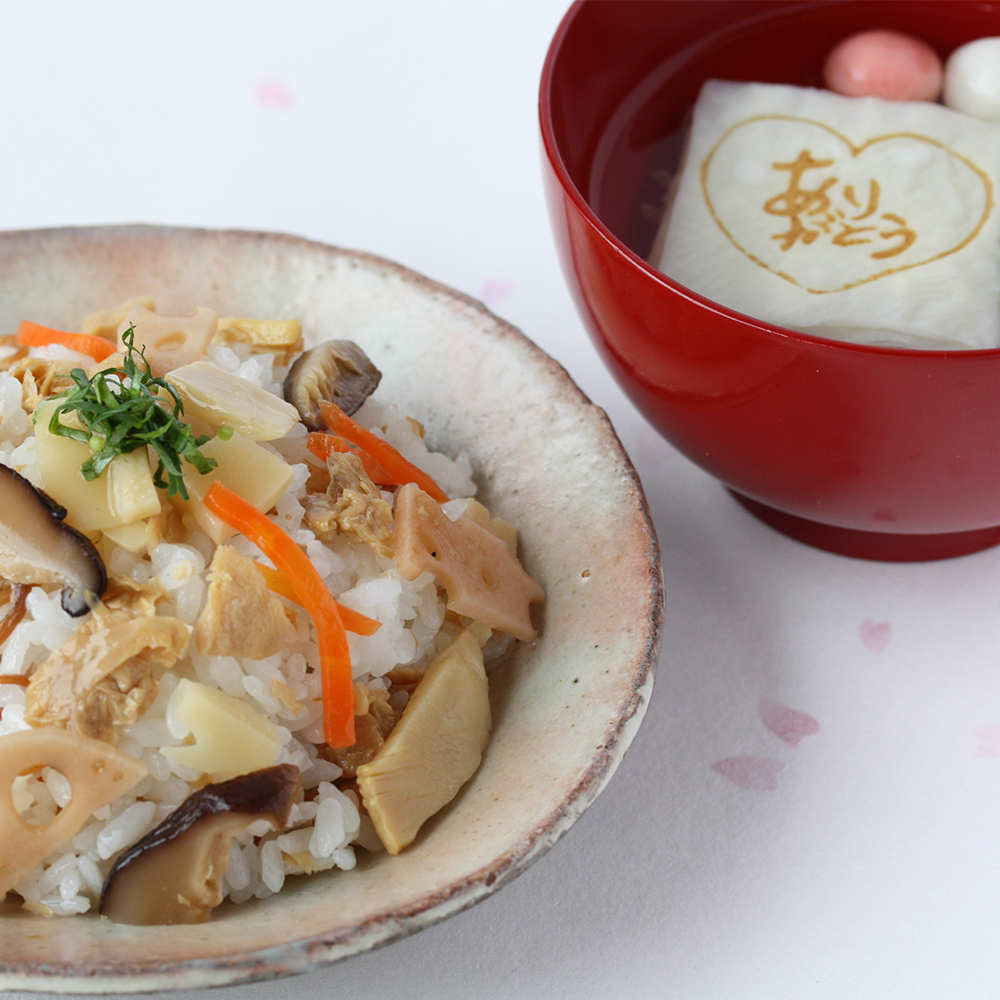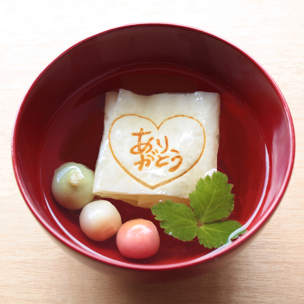 熱湯を注ぐだけで、可愛らしい「ありがとう」文字入りゆばと三色玉麩が入った