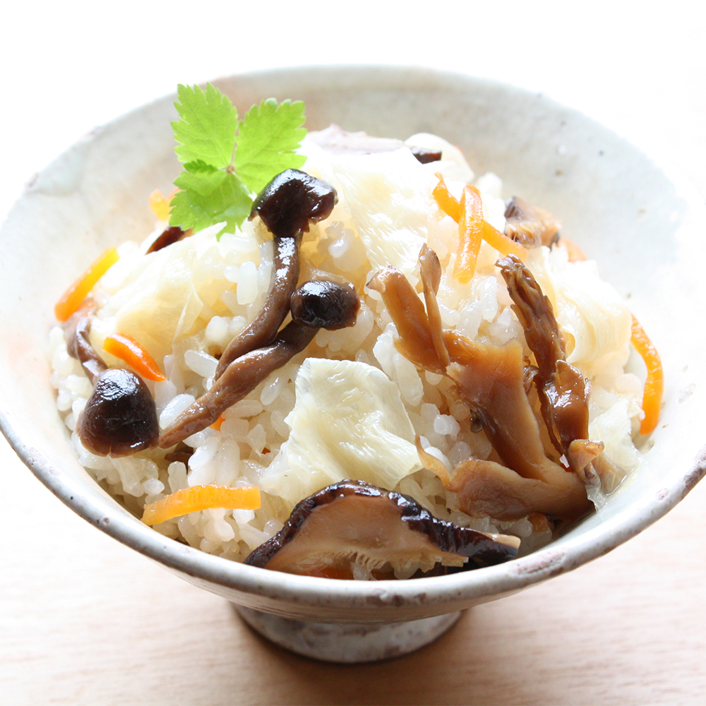 原材料:まぜごはんの素:ぶなしめじ水煮(ぶなしめじ(国産))、乾しいたけ(国産)、うすくちしょうゆ(本醸造)、舞茸水煮(舞茸(国産))、塩蔵人参(人参(国産))、砂糖、本みりん、酵母エキス、醸造酢、昆布エキス、食塩、(一部に小麦、大豆を含む)
