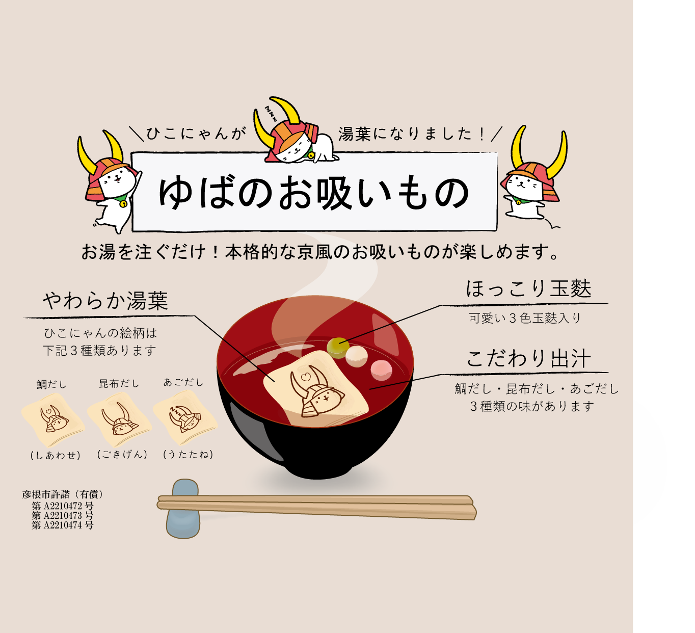 椀だねには、愛らしい「ひこにゃん」の絵入り乾燥ゆばと三色玉麩が入っています。
